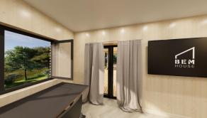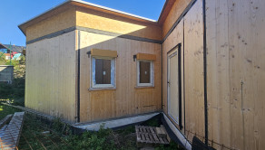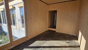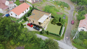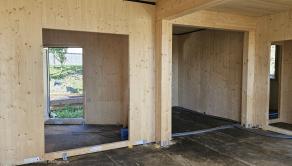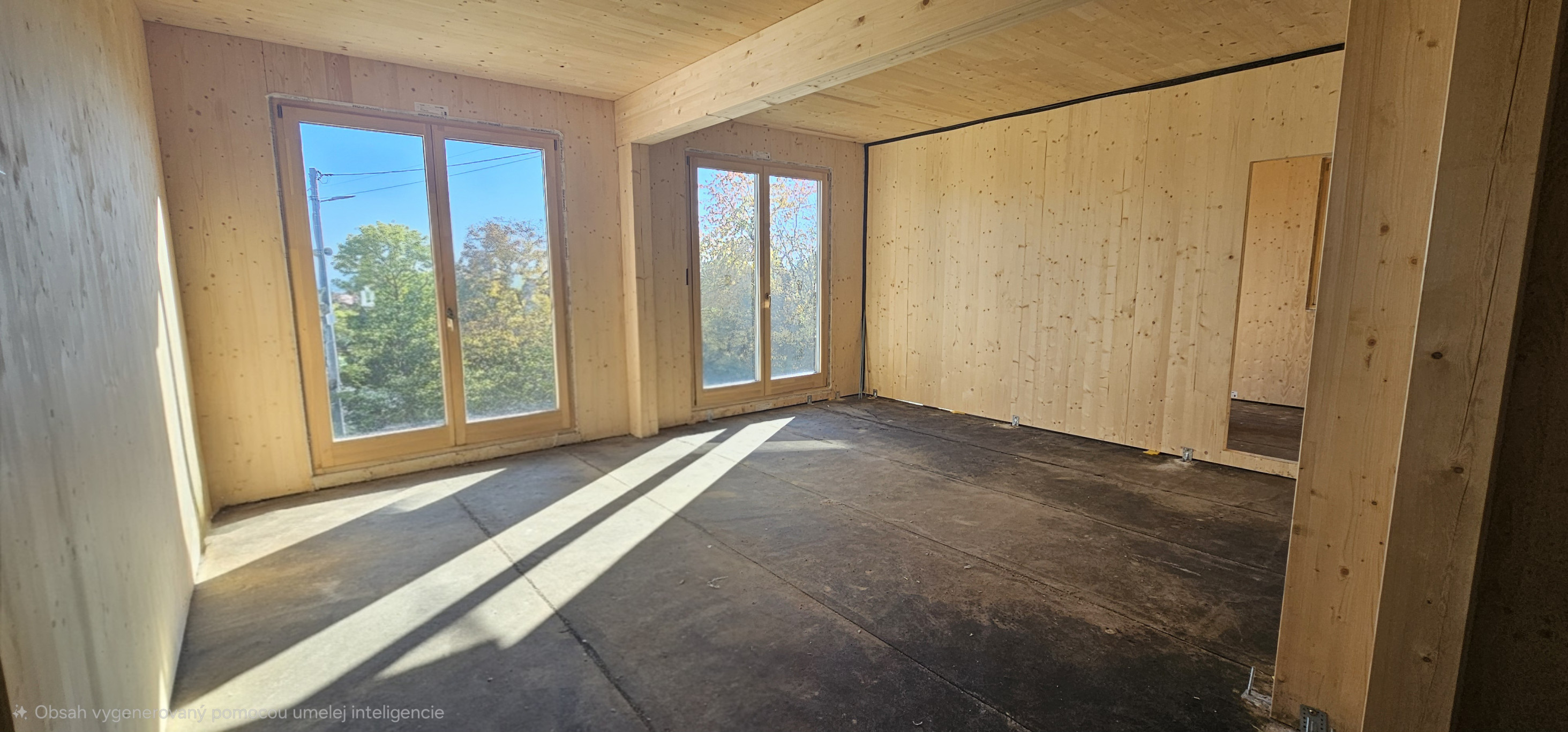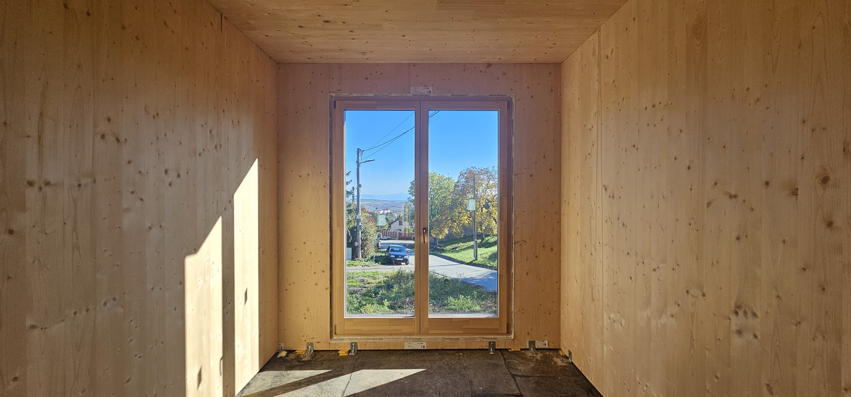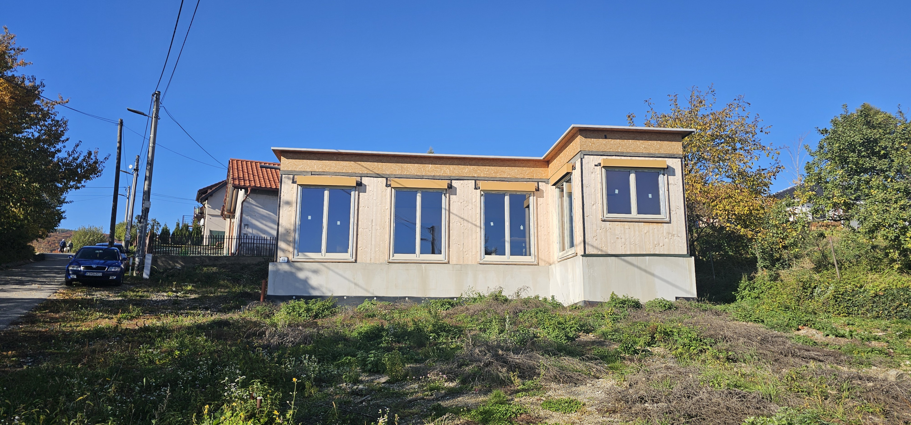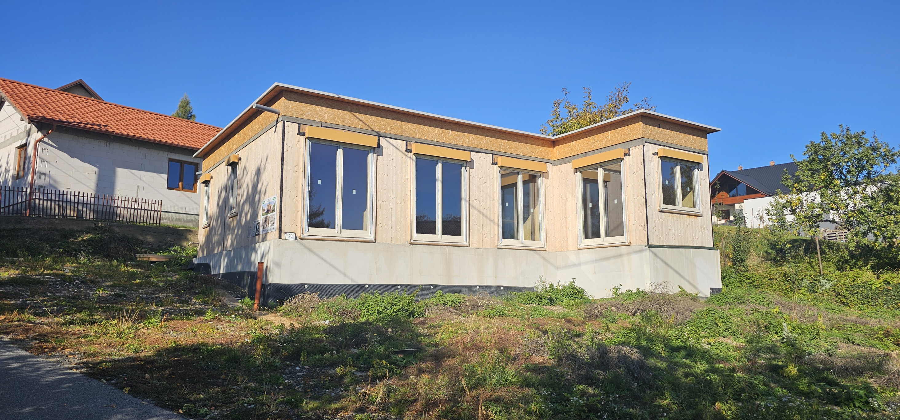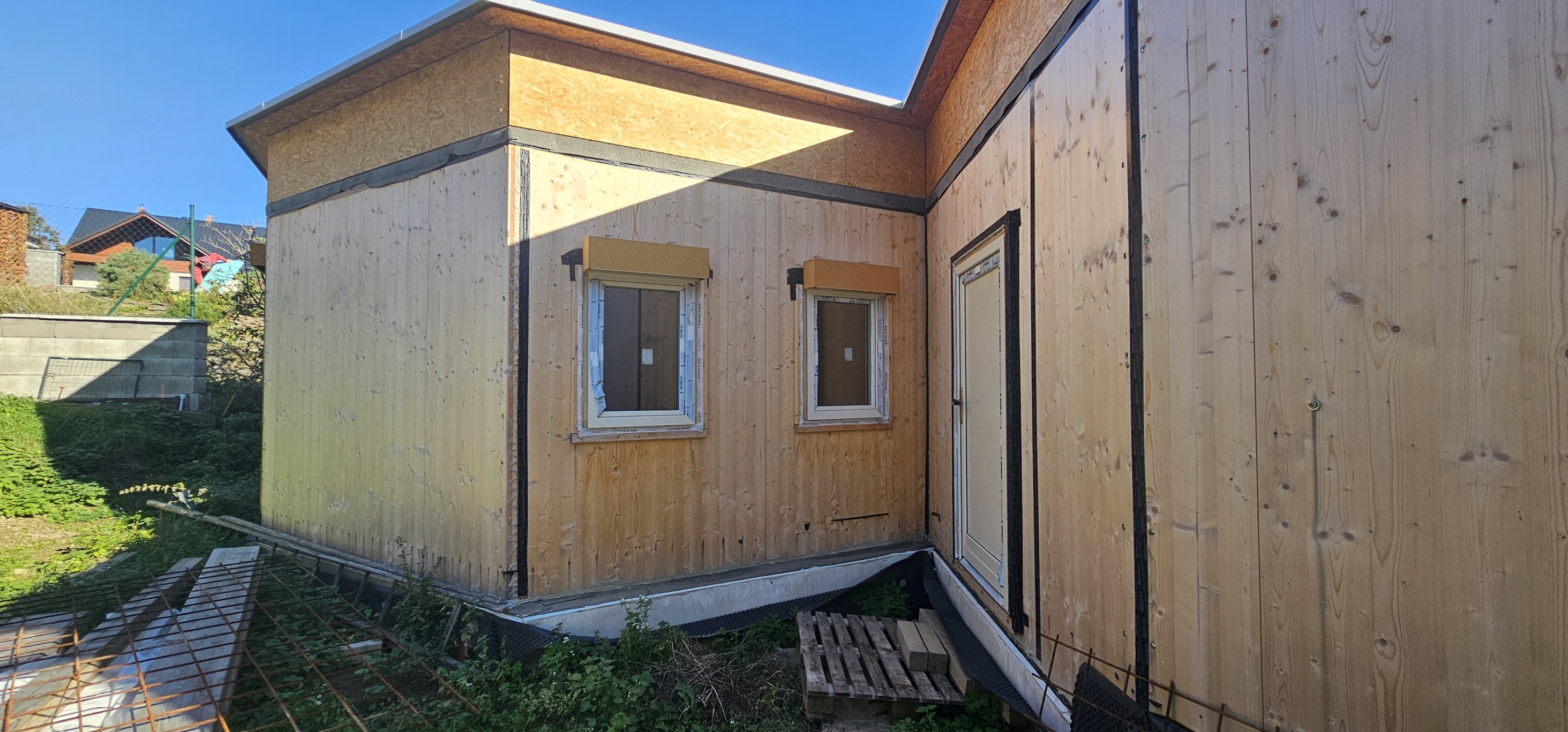 Stavba je v štádiu uzavretej hrubej stavby s rovnou strechou, ktorá je izolovaná minerálnou vlnou, 3 komorovými drevohliníkovými oknami, kanalyzačnými a vodovodnými rozvodmi. Celkové dokončenie je rýchle, nakoľko sa vynechávajú mokré procesy. Náklady na dokončenie sa budú odvíjať od Vašej náročnosti na materiály a či si dokončenie realizujete svojpomocne. Tohtoročné Vianoce môžete prežiť v novom dome.